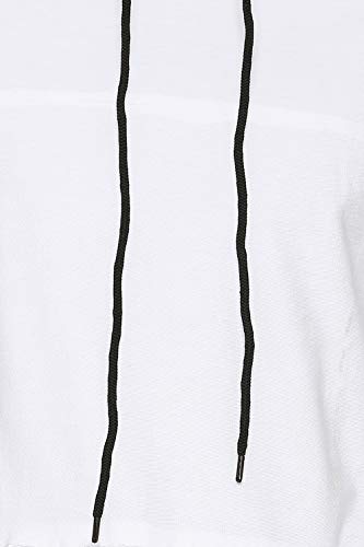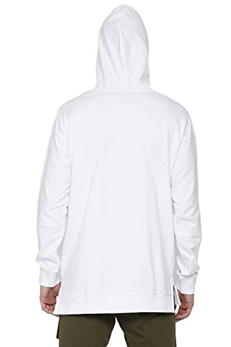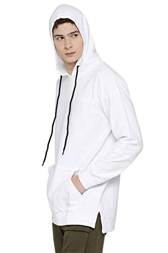 White hooded sweatshirt, long sleeves, a kangaroo pocket on the front, raw edge finishing on the front and sleeves, ribbed along the sleeve hems and hemline, vented hemline. Team this sweatshirt with a pair of black denims and ankle-length sneakers. Relaxed fit, the model (height 6′ and shoulders 19″) is wearing a size m.