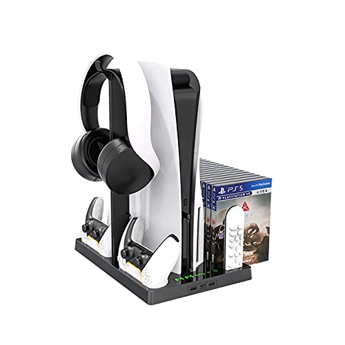 Key Features: 1. Charges your controllers in just 2 to 3 hours; 2. 2-in-1 Mute Cooling Fan for dissipating heat and hanging headphone; 3. The PS5 charging station’s click-in design make it easy to dock them; 4. With indicator lights to can help you know after they’re fully charged; 5. The system has a security chip to stop damage to any of your devices; 6. An extra USB ports for charging your other devices; 7. Storage slots for as much as 14 games; 8. Headphone holder fits snug at the PS5, save room to your desk; 9. Compatible with the PlayStation 5 Disc and Digital Edition. Vital Note: 1.Please use the PS5 to supply power for the charging stand. Other power source would possibly cause that it can not work properly. 2.It should take longer to charge 2 controllers if the use of the additional USB port to charging other devices at the same time. 3.Beneficial to place ps5 controllers on charging stand, not at the headset hanger.