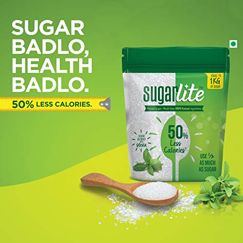 Sugarlite is a blend of sugar and 100% natural stevia. It’s a smart sugar which provides 100% sweetness of sugar, with 50% Less calories. Also it’s an healthier alternative compared to normal sugar. Sugarlite can be used across all food preparations, where sugar is used. Half spoon of Sugarlite provides sweetness equal to 1 spoon of normal sugar.