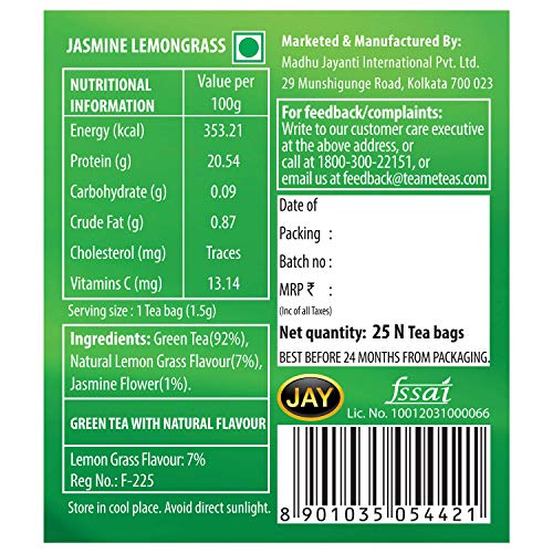 Specification: TE-A-ME Soothe Jasmine Lemongrass Natural Green Tea, 25 Tea Bags