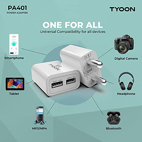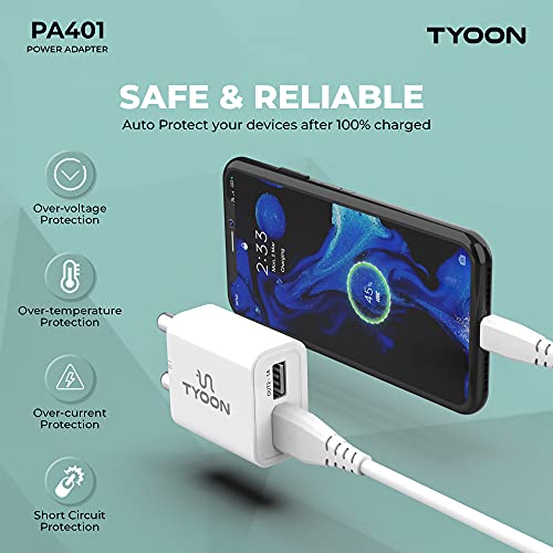 In the past, you had to carry along many chargers, one for each of your devices. Simplify things with the pocket-sized TYOON PA401M 2.4A Universal Fast Charging Dual USB Wall Adapter with Micro USB Cable (White) that can plug into any Indian Socket and charge your devices. This sleek charger with a tough and rigid cabinet has short circuit protection, thermal shutdown protection and over power protection which so your device automatically stops charging when the battery is full. TYOON PA401M 2.4A Universal Fast Charging Dual USB Wall Adapter with Micro USB Cable is BIS approved which is the ultimate stamp of safety and reliability for all your valuable gadgets.