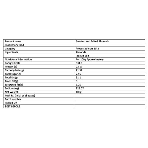 Specification: Vedaka Premium Roasted and Salted California Almonds, 100g