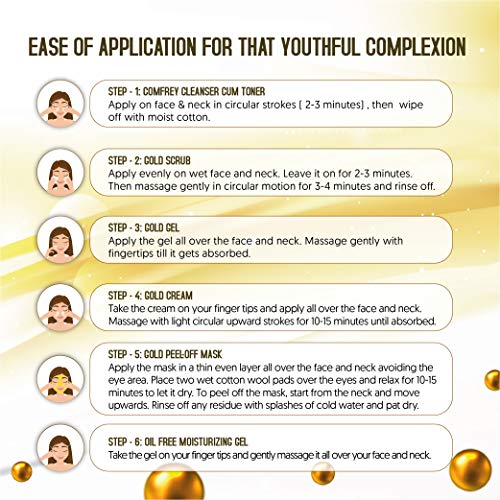 Gold Cream; Gold Peel-off Mask; Usage: Step 1: Comfrey Cleanser Toner – Apply it on the face and neck, massage in upward and outward small circular strokes for 2-3 minutes and wipe off with moist cotton. Pay special attention to the corners of your nose, hairline, chin and neck. Step 2: Indian Barberry Face Scrub – Apply evenly on moist face and neck. Leave it on for 2-3 minutes. Then massage gently in upward and outward circular strokes for 3-4 minutes and rinse off.