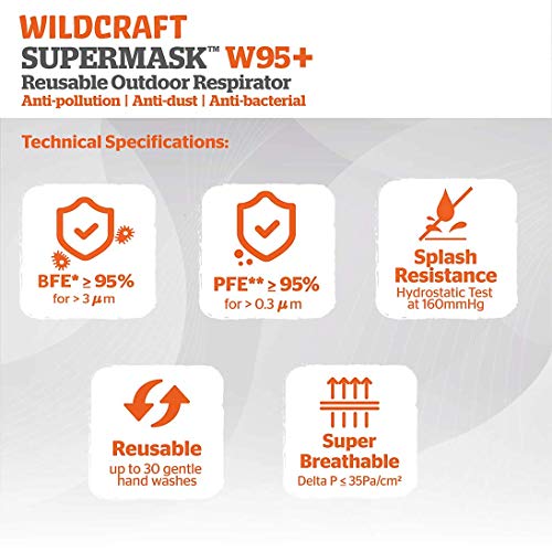 Protection+ : Wildcraft proprietary cartridge PM 2.5 protection,BFE >= 95% for 3 microns size,PFE >= 95% for 0.3 microns size,Tested for breathability & user comfort while offering full protection,Fluid splash resistance of HH 160 mm – Protects against accidental fluid/sneeze droplets from reaching the user’s nose & mouth.