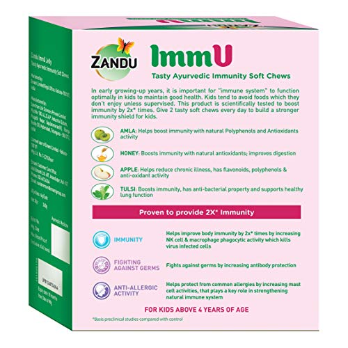 In early growing-up years, it is important for “immune system” to function optimally in kids to maintain good health. Zandu ImmU Tasty Ayurvedic Soft Chews is scientifically tested to boost immunity by 2x times. Give 2 tasty soft chews every day to build a stronger immunity shield for kids. It is made from Amla, Tulsi, Honey and Apple – the key ingredients known to be the power house of immunity boosting nutrients. Amla: Helps boost immunity due to presence of natural Polyphenols and activity, Honey: Boosts immunity, with the presence of property also improving digestion, Apple: Helps reduce chronic illness, contains flavonoids and polyphenols, Tulsi: Boosts immunity due to presence of property and supports healthy lung function.