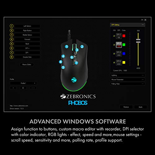 Specification: ZEBRONICS USB Gaming Mouse (PHOBOS) with RGB Lights